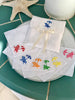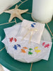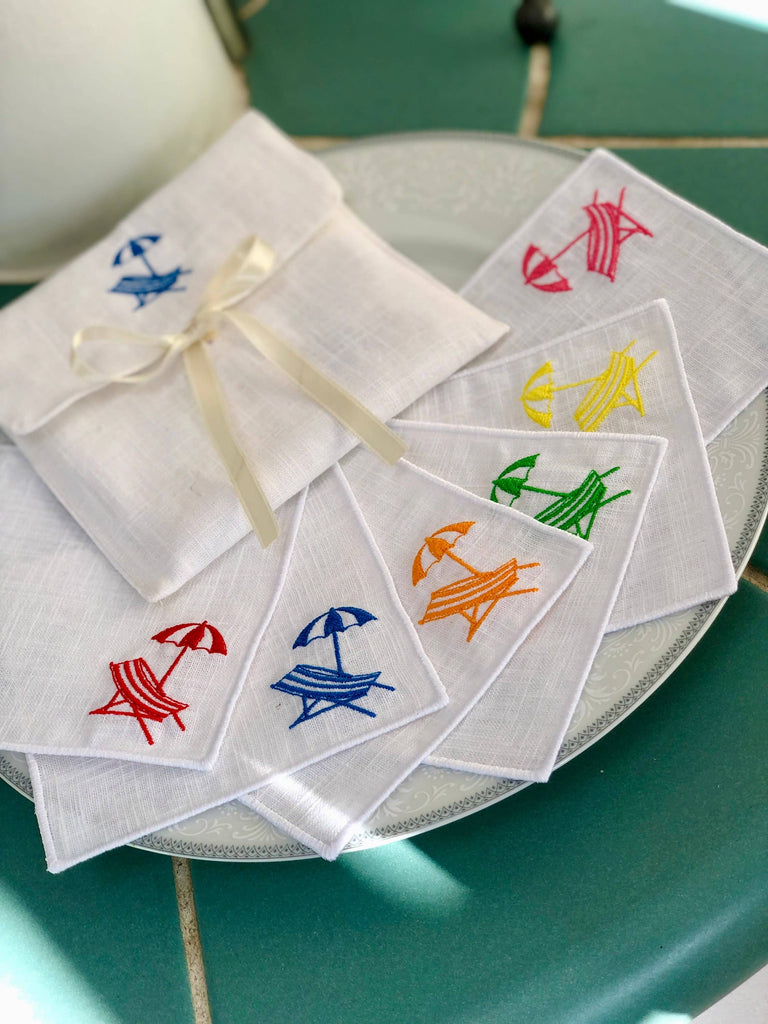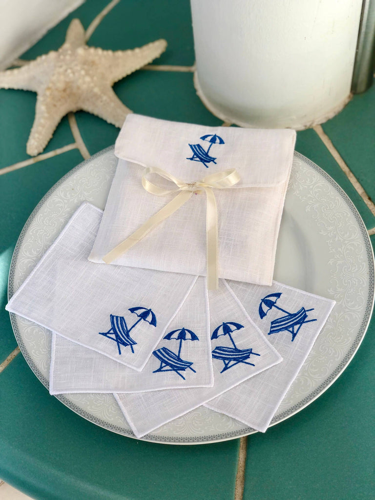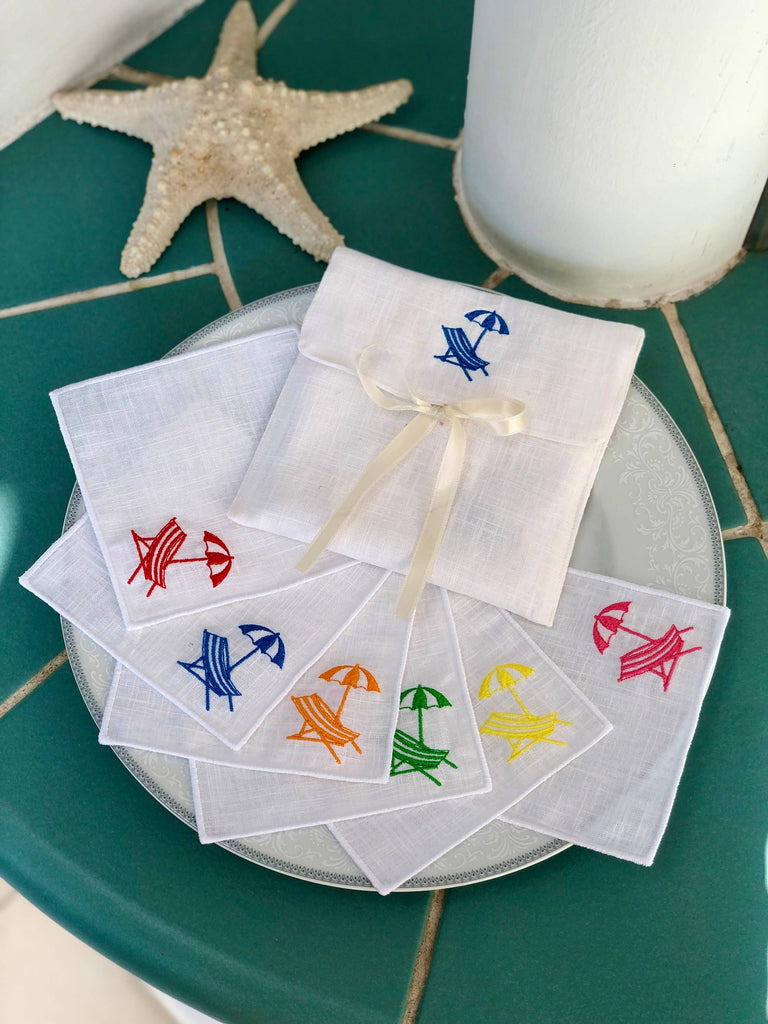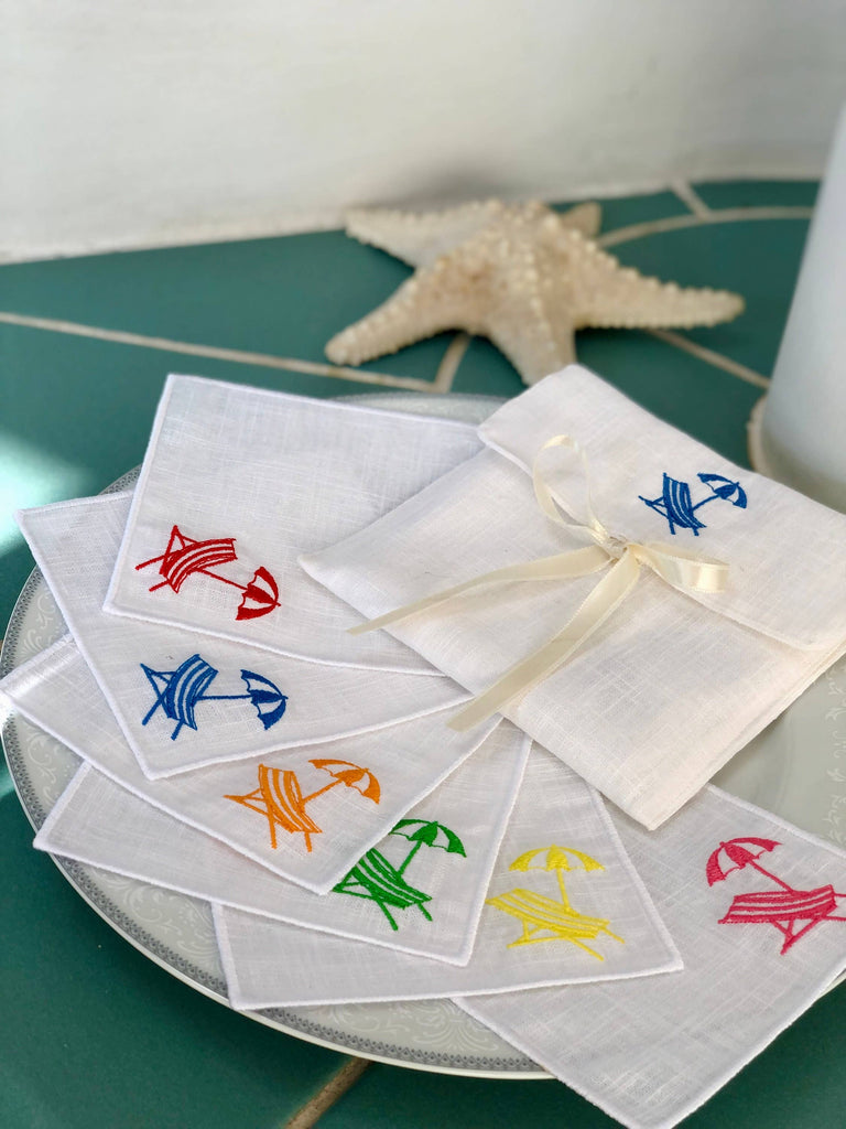 Beach Umbrella Summer Vacation Embroidered Cocktail Napkin Set, ***This set includes 4 (or 6) cocktail napkins and a linen envelope with coordinating embroidery*** Material: 1 layer of 100% European linen, white, 230gsm Cocktail napkin size: ~5x5" inches (approximately 12.5x12.5cm) Cocktail napkin colors: white Please note if you want a specific set of embroidery color, otherwise we will choose randomly. Made in Czechia